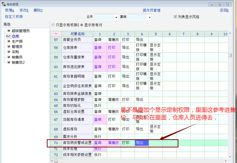 一般仓库人员是看不到进价与售价的吧,他们只管出入库盘点的数量,对这些价格信息不需要知道的当然要用权限来控制,或者说仓库管理者有部分人入库录单需要价格信息,但对其它仓库人员肯定是不需要知道价格信息的,如仓库管理人员的下手需要在这里面设置进货的多少工作,好像说的很模糊,没有举例。里面有用户绑定好像没有什么用。