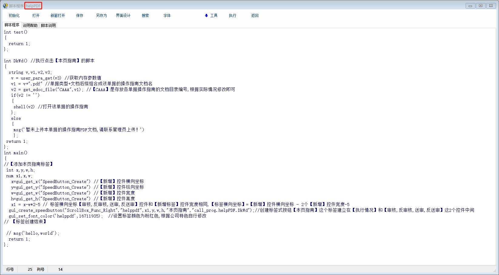 全局变量脚本修改好了,把附件脚本文件【helpPDF.csp】导入,把下列的3行脚本插入到单据的【int func_show()】段即可 【备注:若是在不同单据之间切换点击【本页指南】,打开的是上一次打开的操作指南文档,切换单据之后需要点击【新增】控件来刷新内存的单据类型】 int func_show() { // 把下面的3行脚本插入到要添加【本页指南】控件的单据的【int func_show()】段即可 string v3; user_para_set(v3,v_voucher_type) //把单据类型保存到内存供全局脚本调用 call_str('call_prog.helpPDF'); //第一次打开单据时执行全局脚本【helpPDF】来添加【本页指南】控件 // 添加【本页指南】控件完成 return 1; }; |