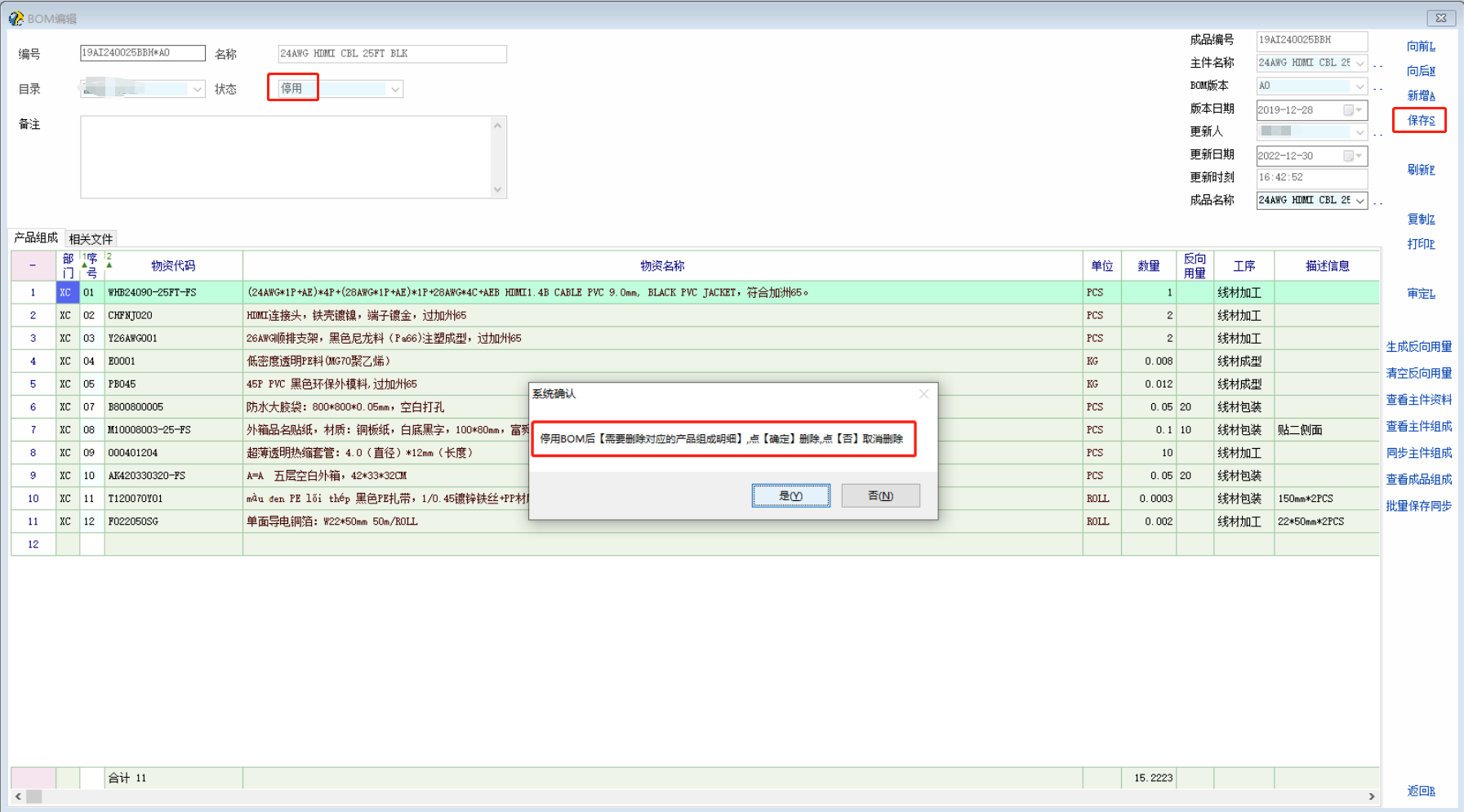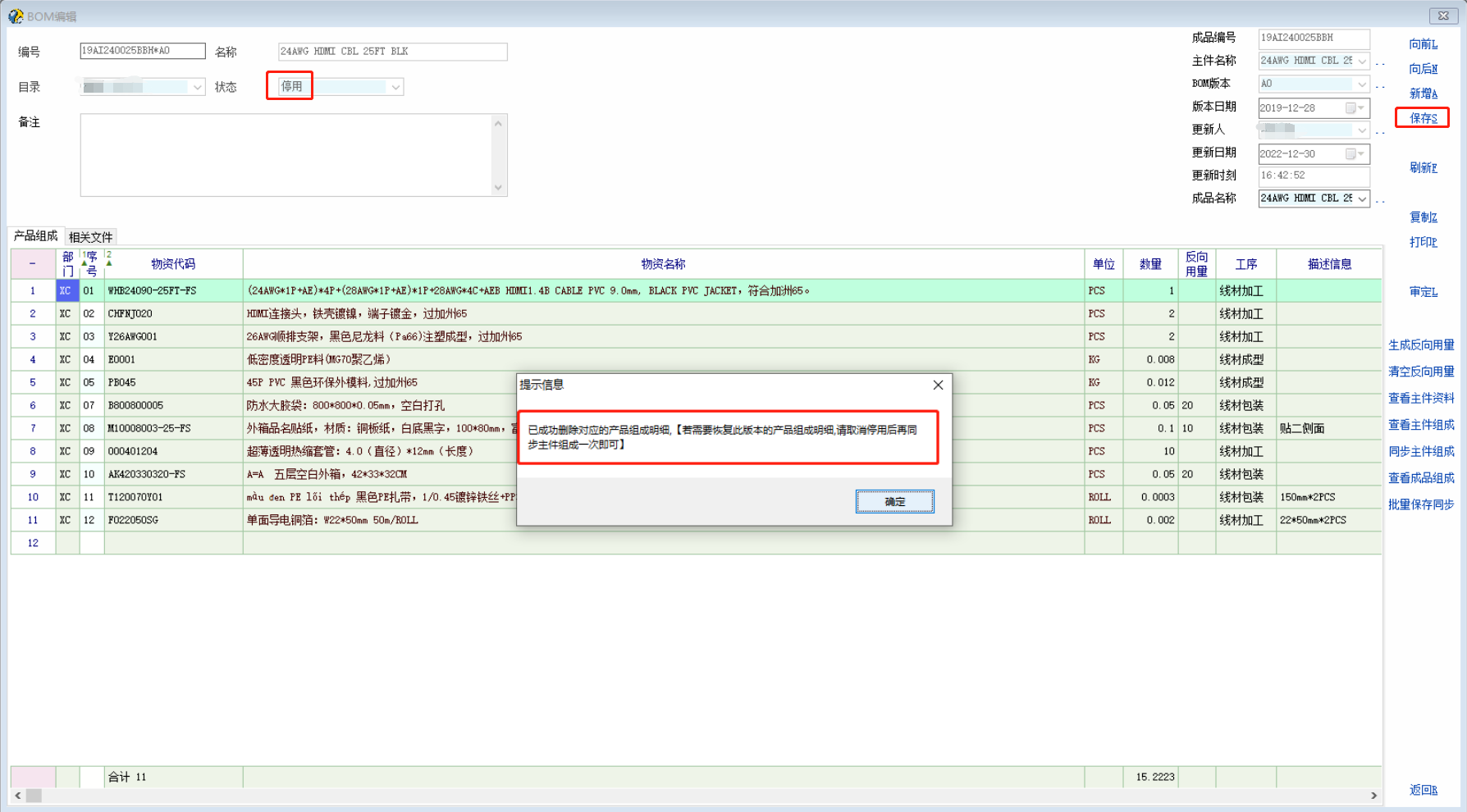 BOM更新建立新版本后,会停用旧版本,有时会先停用旧版本再更新新的版本,为防止在更新【新版本BOM】之前忘记删除旧版本的产品组成明细而被做【材料需求表】,特增加在修改BOM状态为【停用】后保存的时候自动删除对应版本的产品组成明细(若有),并禁止同步停用状态的BOM明细到产品组成明细