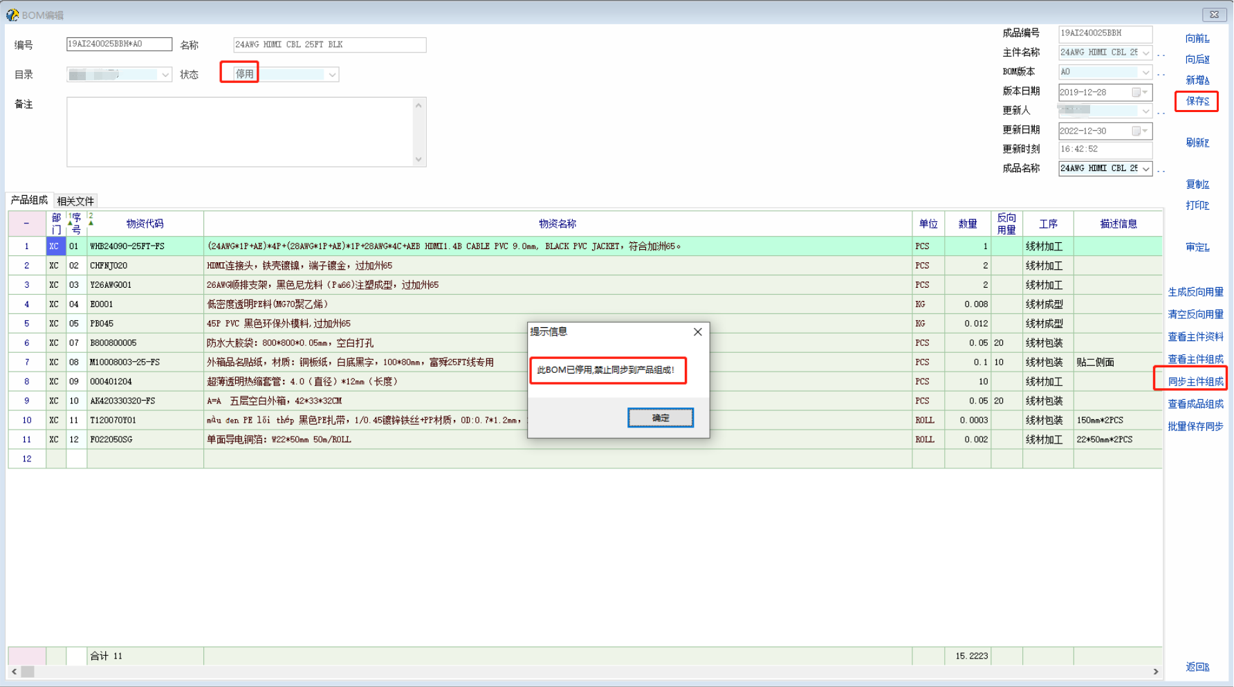 停用后禁止同步主件组成的提示