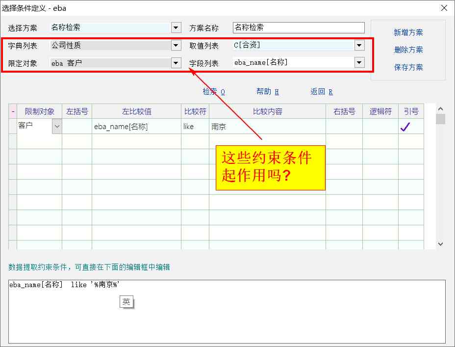 另外,自定义检索条件 指的下图吧? 我想请教 红框中的设置起作用吗? 我测试感觉只有下面表达式有效,红框中好像没作用。