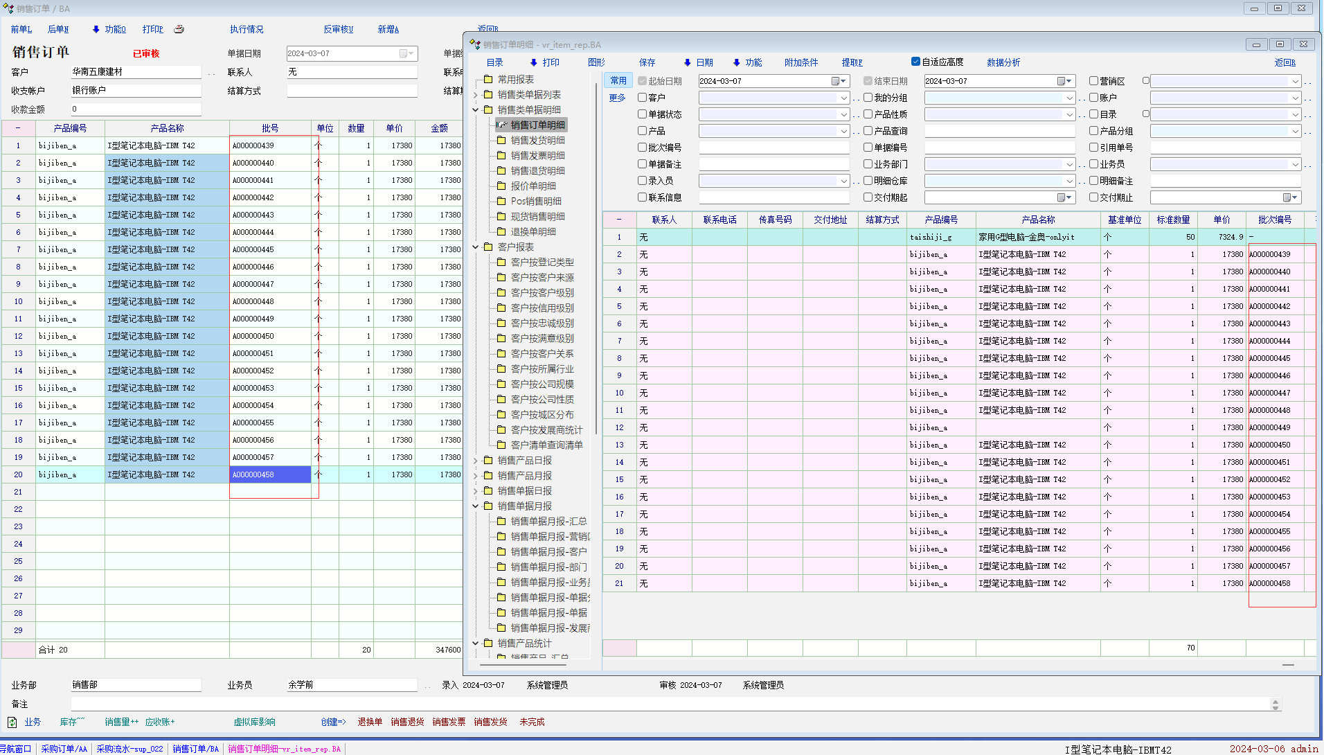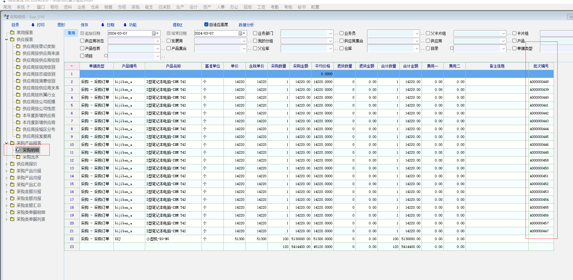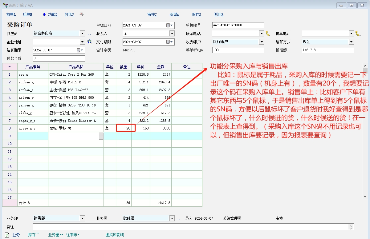 最近碰到这个问题,产品有问题退回来不知道是什么时候送的货(因为每个月都有送)!比如像演示库里的电脑鼠标一样,过一两个月客户都要下一些来,偶尔有两个坏的,不知道是什么时候送的,想在备注后面加写上SN码,但有时候产品比较多,不方便添加,这个用什么方法可以溯源的吗?系统有没有产品出入设置SN码的功能?我想在销售单据里记录,再到一个报表里面查询(像流水帐里)!这个功能应该像药品行业一样