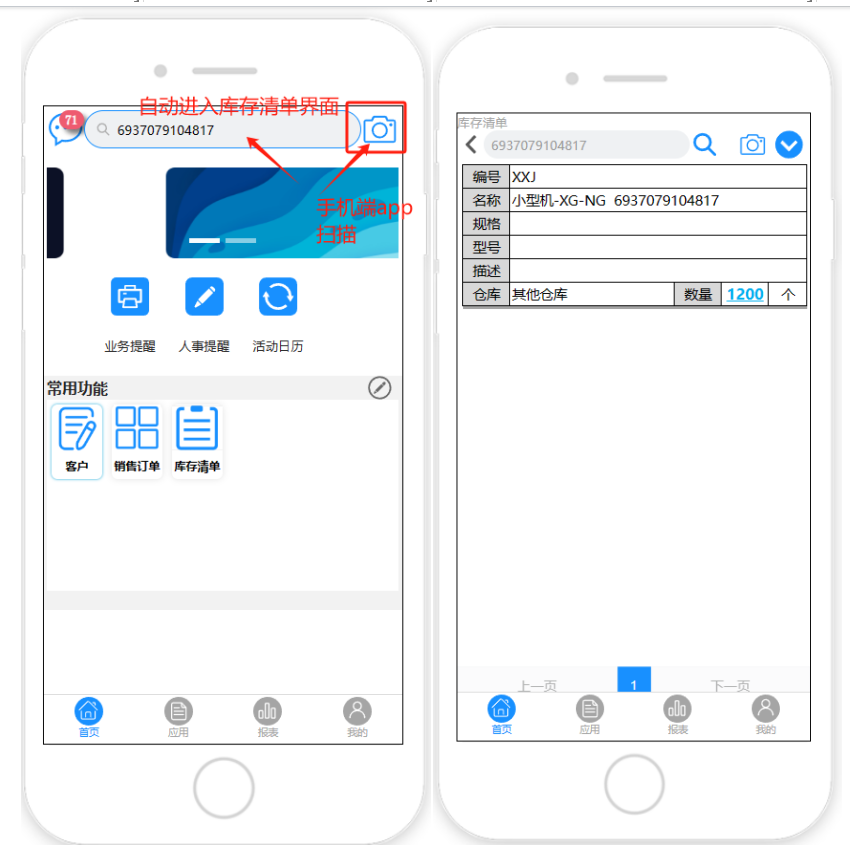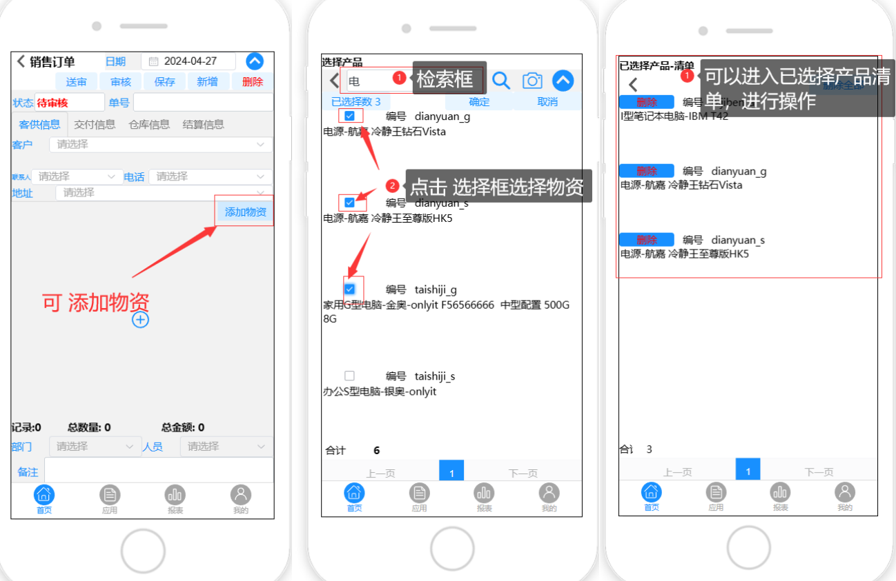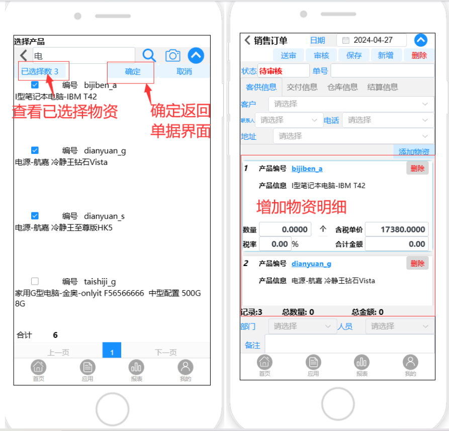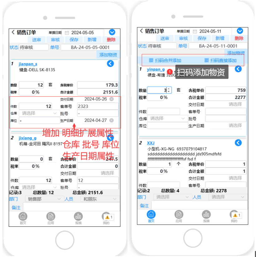 用移动端来录单最快的方法是扫条码,扫出来的数量默认是1,改数量设置个加号来加一,价格方便如果有批发价选项,显示出批发价,没有选项默认参考销价,