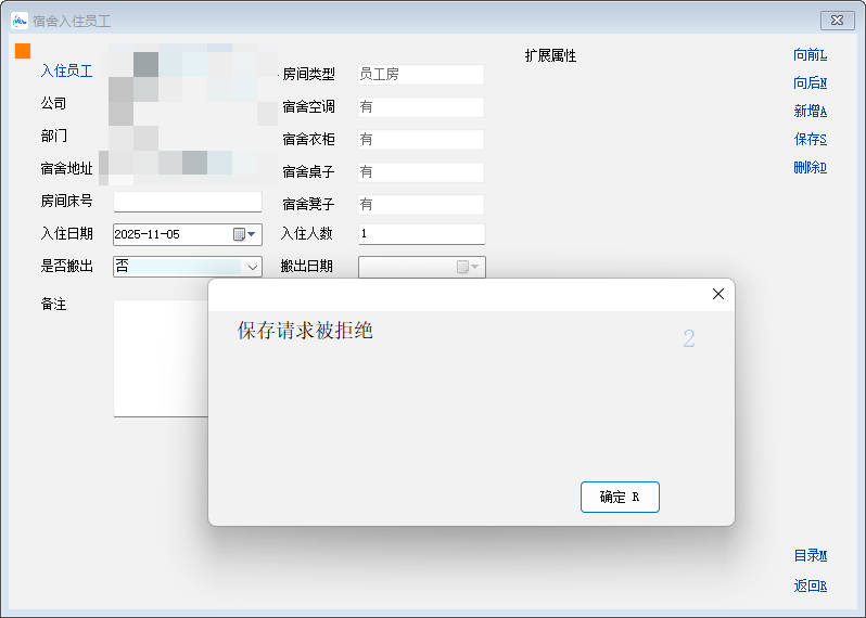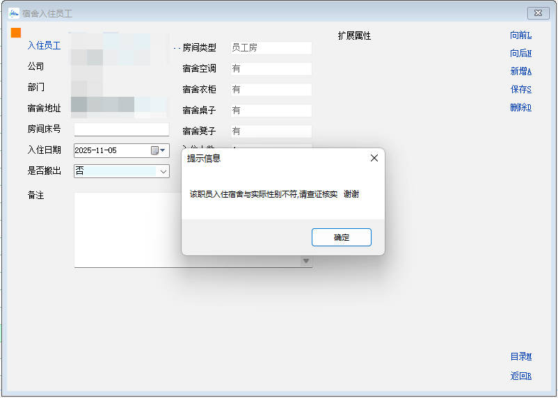 msg("该职员入住宿舍与实际性别不符,请查证核实   谢谢");//弹窗提醒