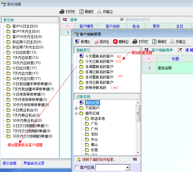 在客户管理界面中已经添加了超期未联系及超期示销售日期的提示,但事务提醒中却没有添加这两种提醒