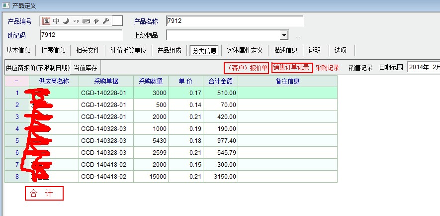 1、建议在产品定义分类信息中增加产品采购、销售记录中的数量及金额的合计项,当前库存产品数量的合计项。