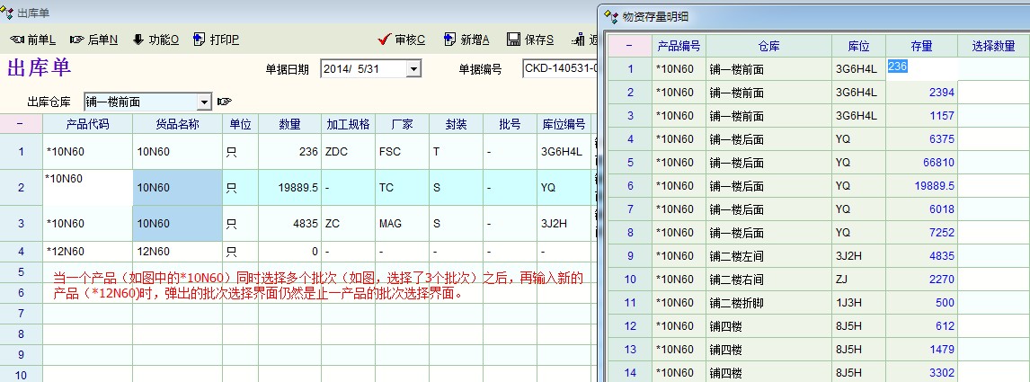 如果同一个产品的几个批次分多次输入并一次只勾选一个批次,则不会出现上面所说的情况。如上图中的*10N60的3个批次,