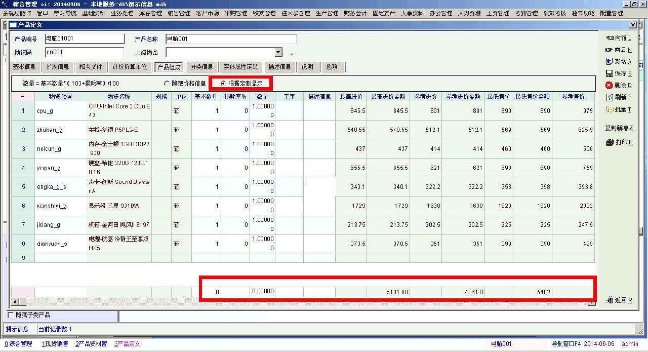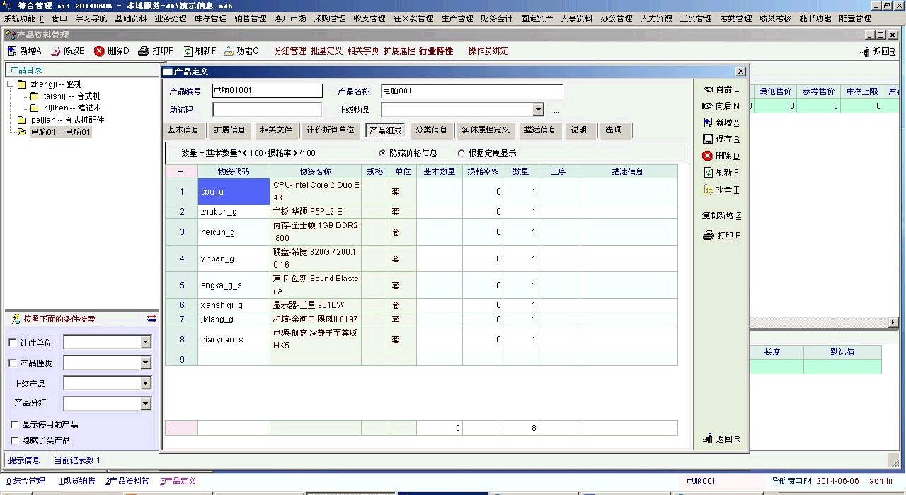 企业内某个零件是另外几个零件组成的,如何选中某个零件,其他几个零件的价格和数量就形成了。