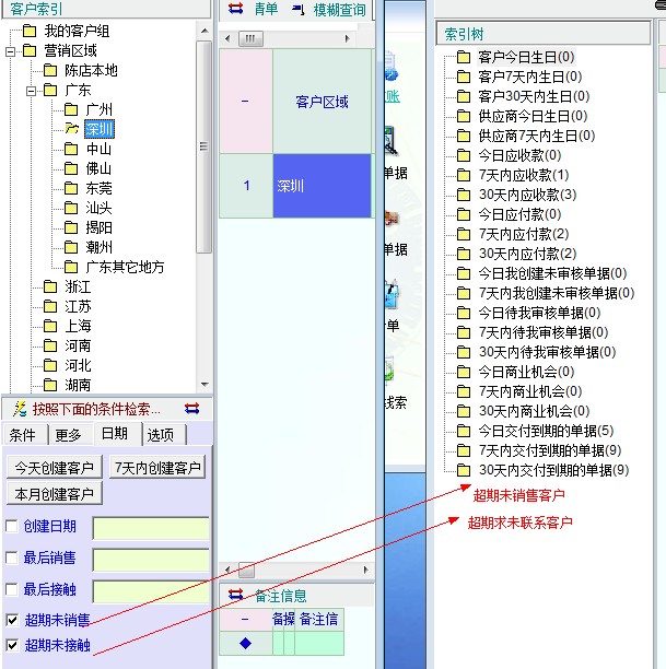 客户管理中的超期未销售及超期未接触条件检索功能对于客户销售情况的及时跟进非常有用,但美中不足的是没在事务提醒中对这些进行提示,建议在在事务提醒中增加对超期未销售及超期未接触客户的提醒,否则这个功能好像残废了一样,发挥不了应有的全部作用。