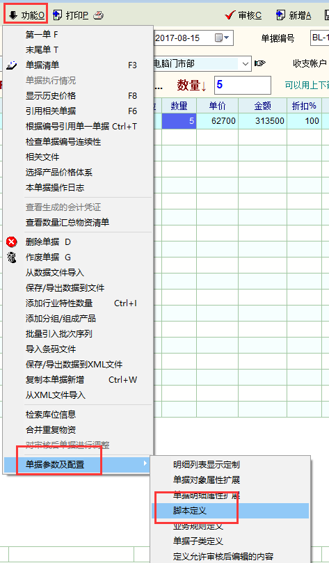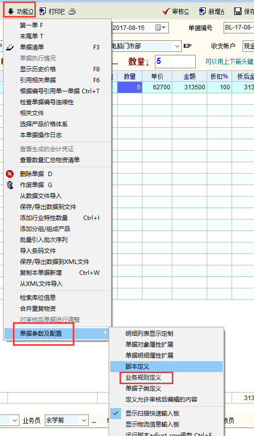 int cell_change() { num edt_num,used_num,findnum; int findrow; string sql,resid,voucher_typ; voucher_typ = 'BL';//将BB改为所需定制的单据的类型,参考最后一幅图的说明。 if(change_col == 'inp_num') { resid = grid_get_v('MG_Item','res_id',change_row_id); sql = "select sum(a.inp_num) as inp_num from ebs_vr_item a left join ebs_v b on a.voucher_id = b.voucher_id where b.voucher_id <> " sql = sql + voucher_id + " AND b.voucher_type = '" + voucher_typ + "' and b.state = 'A' and a.res_id = '" + resid + "'" db_run(sql) used_num = db_res(0) edt_num = grid_get_v('MG_Item','edt_res_num',change_row_id); //开始查找表格中已经输入同种产品数量 findrow=grid_find('MG_Item','res_id',0); while(findrow!=-1) { //首先判断是否在本身这行 if(findrow>=change_row_id) { break; } findnum=grid_get_v('MG_Item','edt_res_num',findrow); edt_num=edt_num-findnum; findrow=grid_find('MG_Item','res_id',findrow+1); } grid_set_v("MG_Item",'kykc', change_row_id,edt_num - used_num); } //change_col,change_col_id,change_row_id return 1; }; |