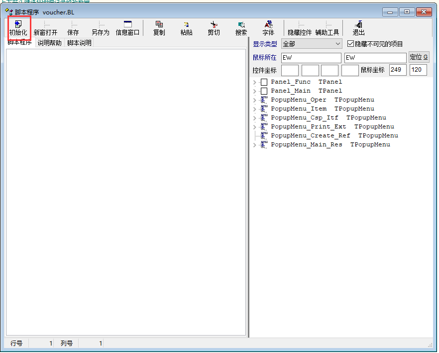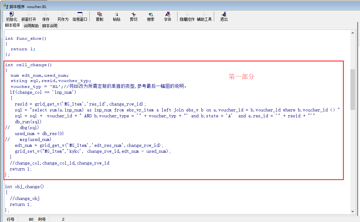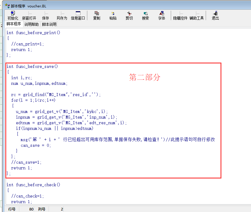 见图示的 几个步骤: 第五步:黏贴或附加下列脚本的两个部分按顺序到示例图红框处替换到原来的脚本: 第一部分: int cell_change() { num edt_num,used_num; string sql,resid,voucher_typ; voucher_typ = 'BL';//将BB改为所需定制的单据的类型,参考最后一幅图的说明。 if(change_col == 'inp_num') { resid = grid_get_v('MG_Item','res_id',change_row_id); sql = "select sum(a.inp_num) as inp_num from ebs_vr_item a left join ebs_v b on a.voucher_id = b.voucher_id where b.voucher_id <> " sql = sql + voucher_id + " AND b.voucher_type = '" + voucher_typ + "' and b.state = 'A' and a.res_id = '" + resid + "'" db_run(sql) // dbg(sql) used_num = db_res(0) // msg(used_num) edt_num = grid_get_v('MG_Item','edt_res_num',change_row_id); grid_set_v("MG_Item",'kykc', change_row_id,edt_num - used_num); } //change_col,change_col_id,change_row_id return 1; }; 第二部分: int func_before_save() { int i,rc; num u_num,inpnum,edtnum; rc = grid_find("MG_Item",'res_id',''); for(i = 1;i<rc;i++) { u_num = grid_get_v('MG_Item','kykc',i); inpnum = grid_get_v('MG_Item','inp_num',i); edtnum = grid_get_v('MG_Item','edt_res_num',i); if(inpnum>u_num || inpnum>edtnum) { msg('第 ' + i + ' 行已经超出可用库存范围,单据保存失败,请检查!')//此提示可自行修改 can_save = 0; } }; //can_save=1; return 1; }; 记住最后一步二箭头所示类型编号以便修改脚本 |