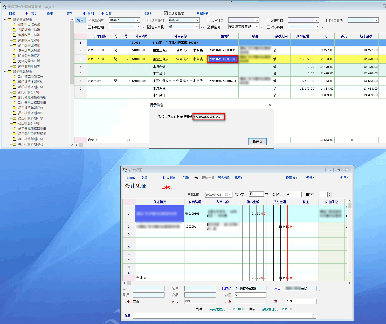 凭证报表-供应商分账期核算明细,提取供应商对应账期的凭证后,双击某条记录提示“系统里不存在该单据编号 VA220728A00051GGC”