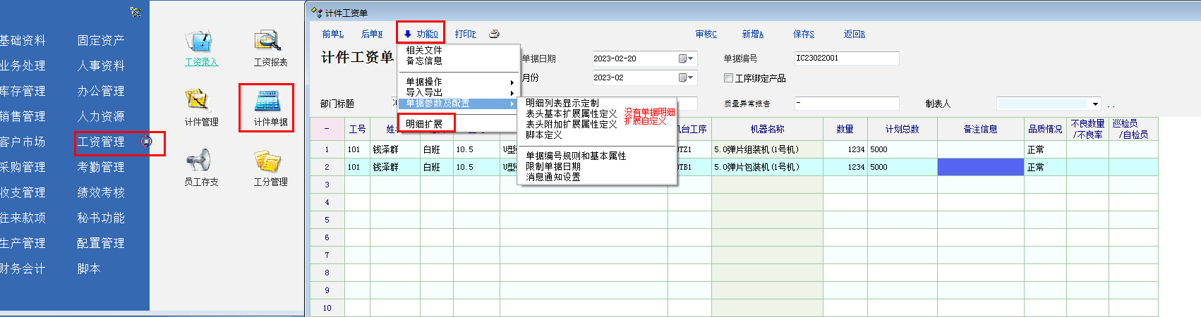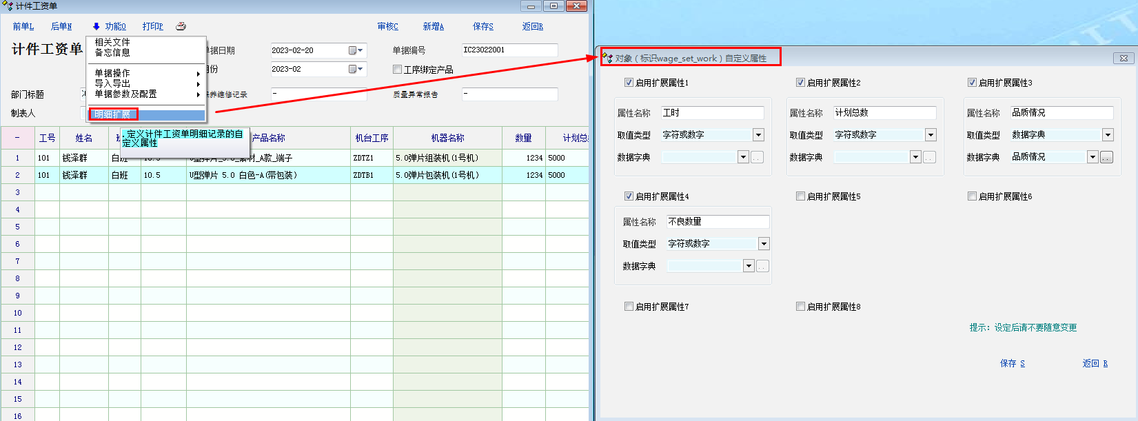 计划把这个“计件工资单”改成一个简易的日产能报表,其中体现一些想要的信息,比如巡检信息等,但是自带的单据明细-自定义属性目前只有4个,无法满足后续想增加的一些信息,所以看能不能像采购单或是销售单一样增加“单据明细附加扩展属性定义”后续可以自己加扩展,或是把原本自带的4个明细扩展属性增加至8个,谢谢