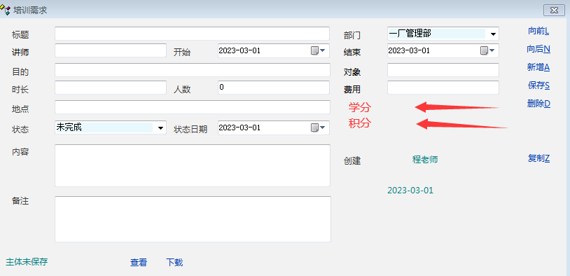 希望在培训需求里面添加上这个需求可以定为多少学分以及多少积分,以便学了这个培训课程后,可以统计学分与积分。