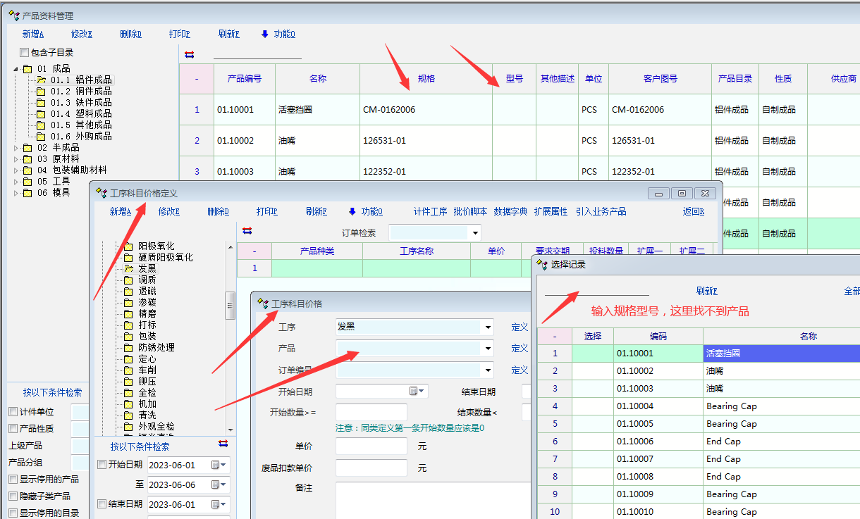 2,计件工序-----选择产品---输入产品规格型号,找不到产品,如图显示-------这里产品定义里面最好添加上规则型号,以便这里可以“引入业务产品”的时候也把规则型号都一起引入,这样检索起来就方便了。