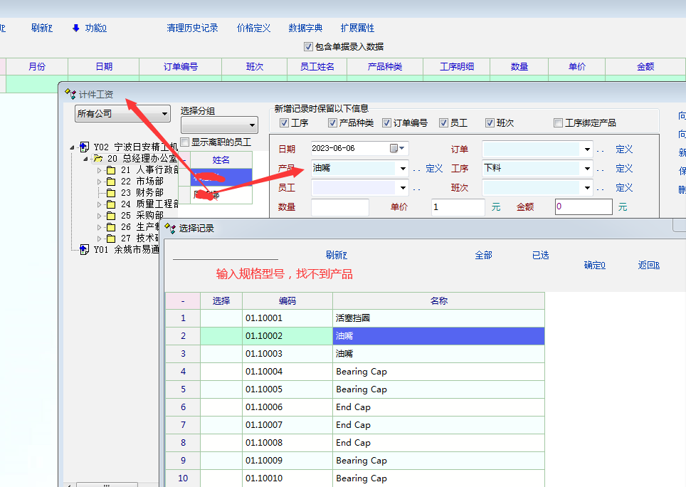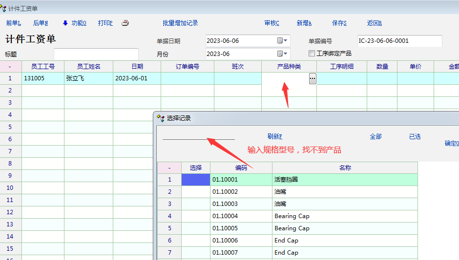 原创_计件单据----添加产品规格型号--------计件工序-----选择产品---输入产品规格型号,找_人力资产