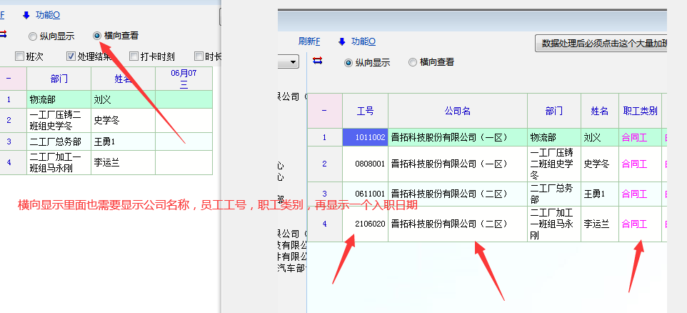 日帐横向显示里面添加:公司名称,员工工号,职工类别,入职日期,的显示,方便识别