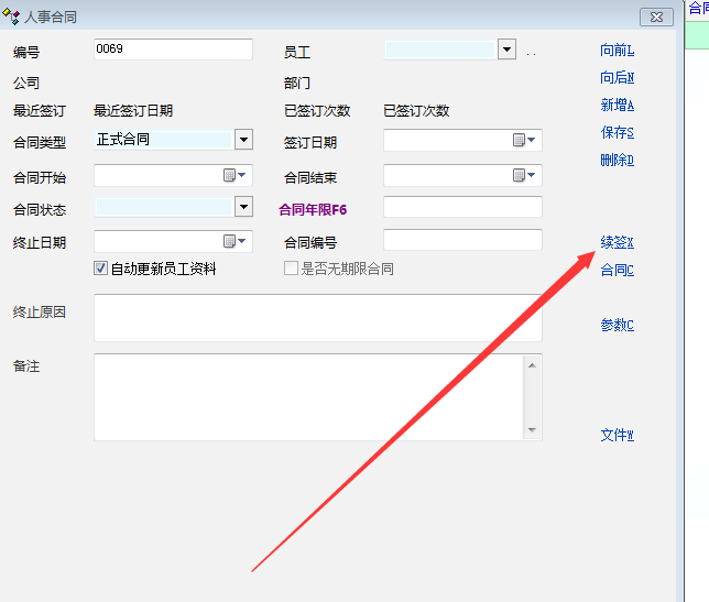 点击-人事合同----选择员工---人事合同上显示这个员工的合同记录--点击“续签”---生成新的合同日期,预览后,点击生成新的PDF版本合同 ---点击发送消息给员工------员工手机版本或者浏览器登录系统,打开人事合同模块,打开自己的电子合同----拍照并签字-保存后---系统内保存签字后的PDF版本合同到该员工资料文档里面(文档最好有自动分类,按公司---部门分类)