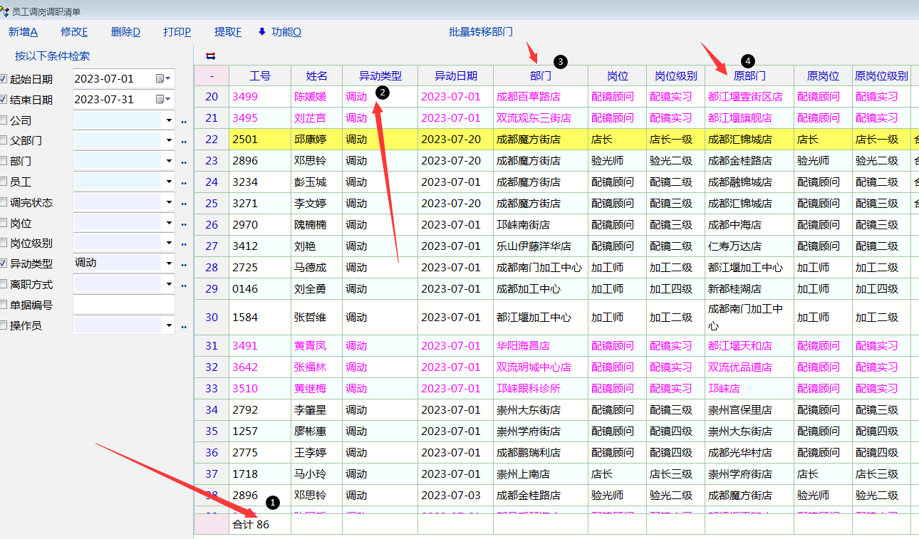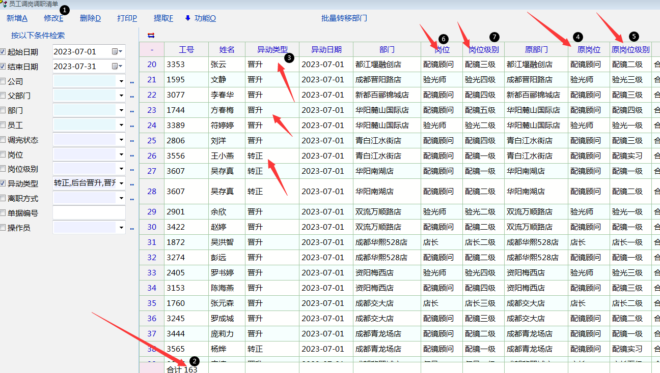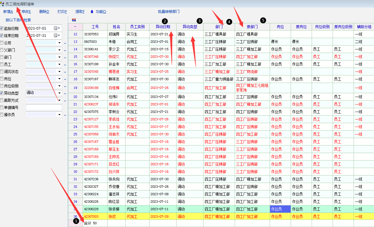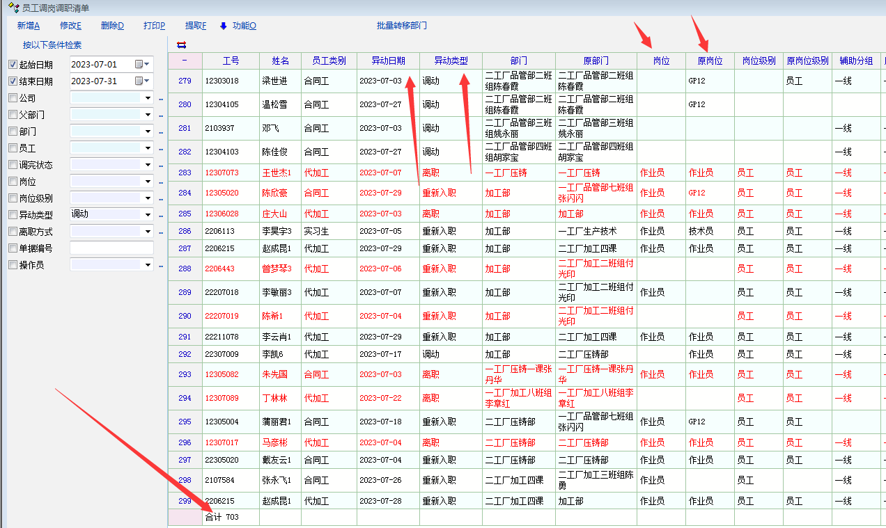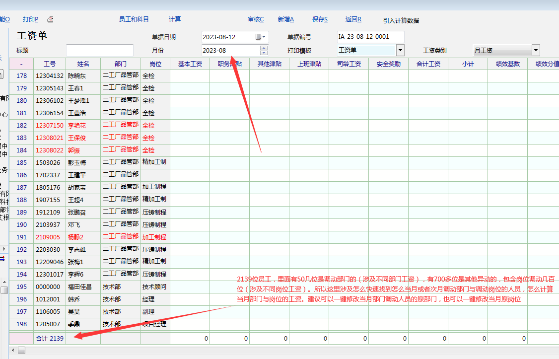 2,目前工资单里面右键虽然可以修改部门,岗位,级别等,但这是需要一个员工,一个员工去修改的(工作量很大),不可以一键修改所有部门异动,岗位级别异动的员工;