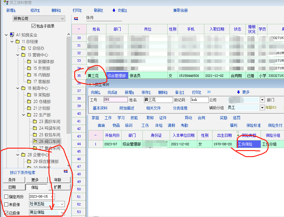 员工卡片界面保险标准项内建立员工保险数据,假设分单独工伤险、商业险、社保五险,某员工入职后选择不同的保险类别建立个人数据后因个别原因调整或变更保险类目,那么在员工资料管理左边栏目中“按以下条件检索”中出现了数据故障,比如这个员工曾经有商业保险,现在停了商业险后在条件检索后还是有这个人员数据。以前有社保五险后修改商业保险,条件检索还是会出现重复出现