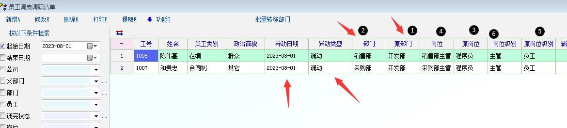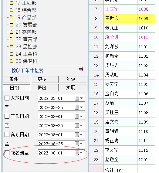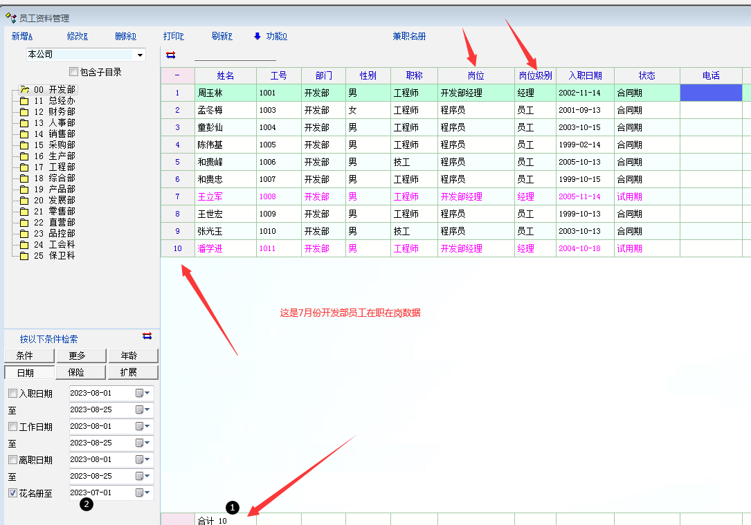 限定花名册日期后直接点检索, 此时提取的内容为指定日期的资料。 如果要限定部门可以通过点表格标题过滤。