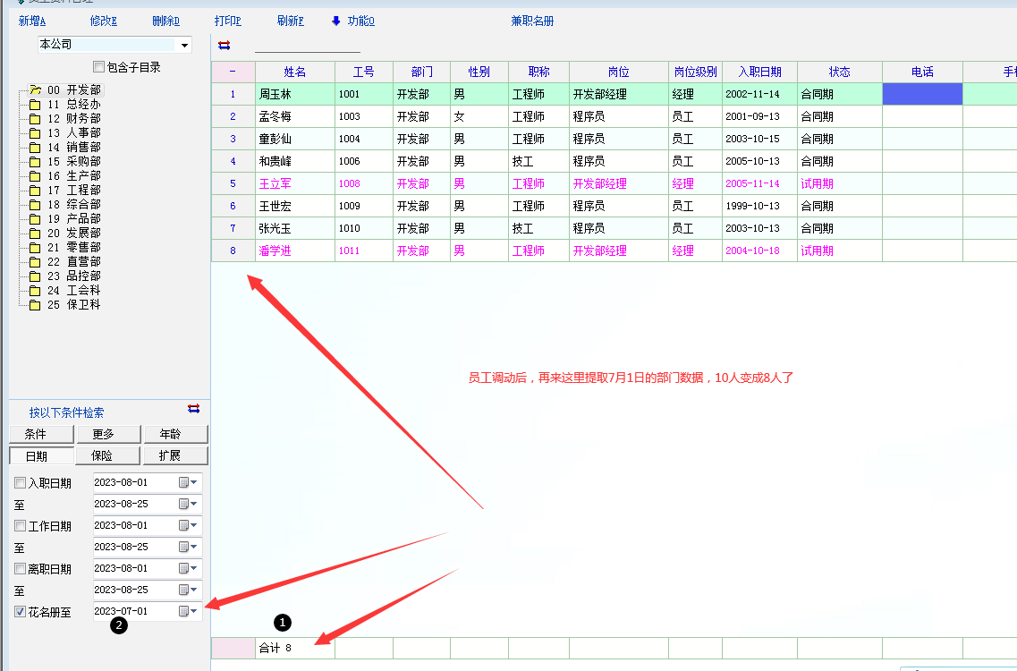如果根据7月1日在职数据,不管什么时候提取,7月1日都是10人。而不是调动后,再去提取7月1日的数据变成8人了