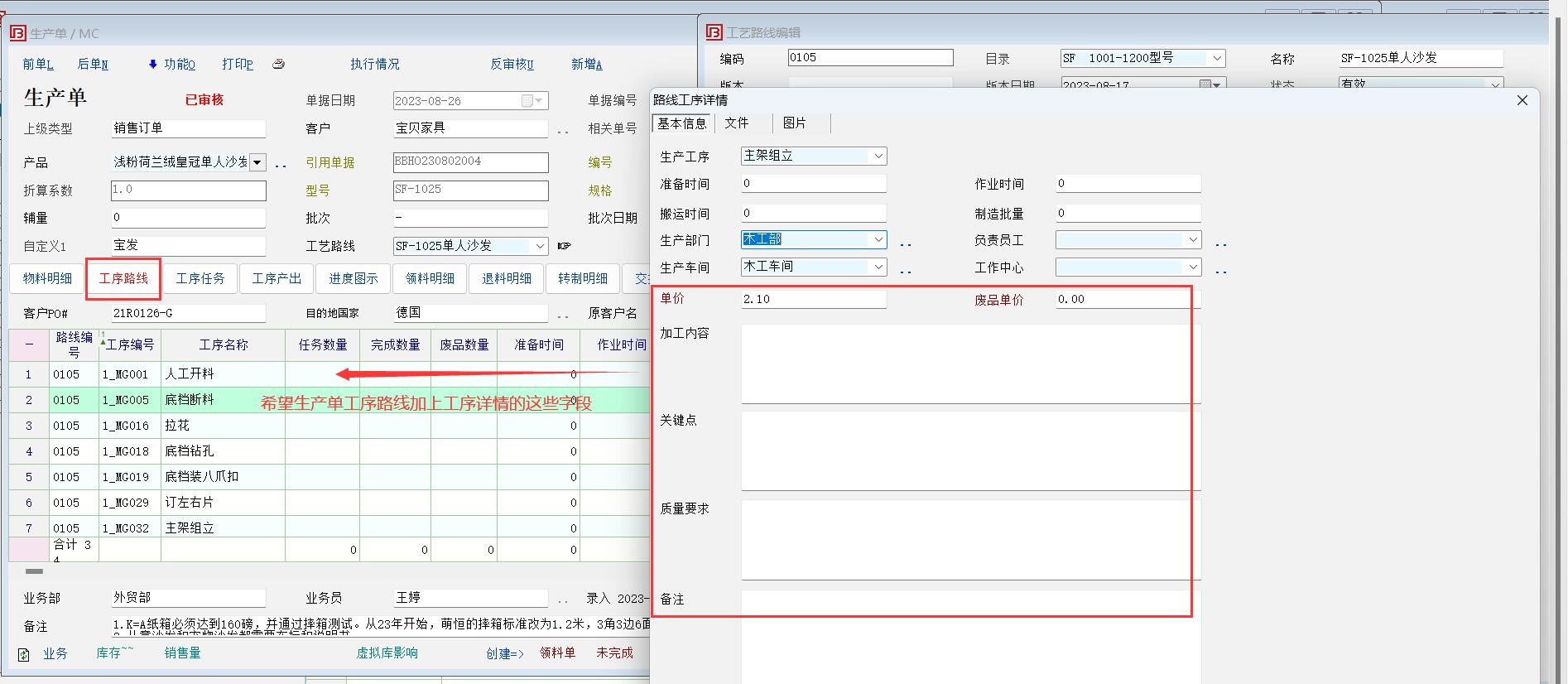 希望生产单--工艺路线增加单价、加工内容、关键点、质量要求、备注等显示定制,不用去查找工序详情;工序任务也希望加上,打印出派工单也更加的清晰;