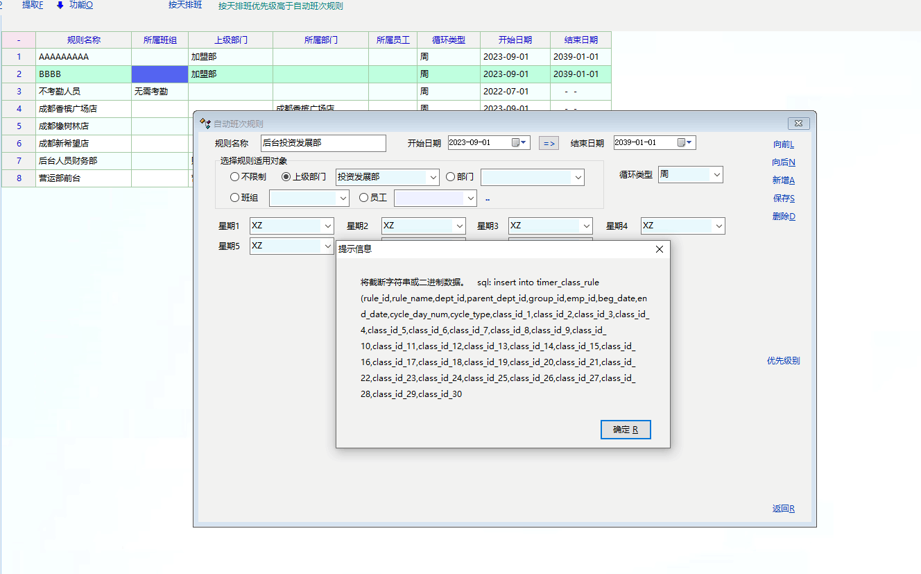 考勤模块----员工排班---自动规则-----保存出错--------是不是部门ID限制了8位数造成?------急需解决!!!!!