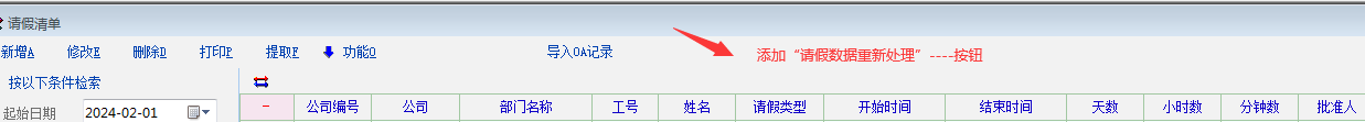 1,请假记录里面-----添加“请假数据重新处理”------按钮;