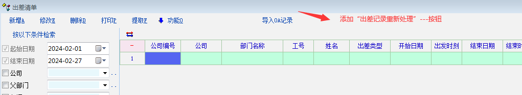 2,出差记录里面-----添加“出差数据重新处理”------按钮;