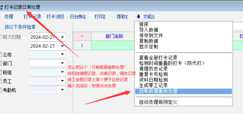下次发布版本考勤主菜单下会增加日帐重新处理功能。