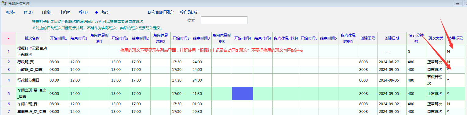 原创_考勤班次里面不要直接显示停用的班次---停用的班次不要参与根据打卡记录自动匹配班次_人力资产