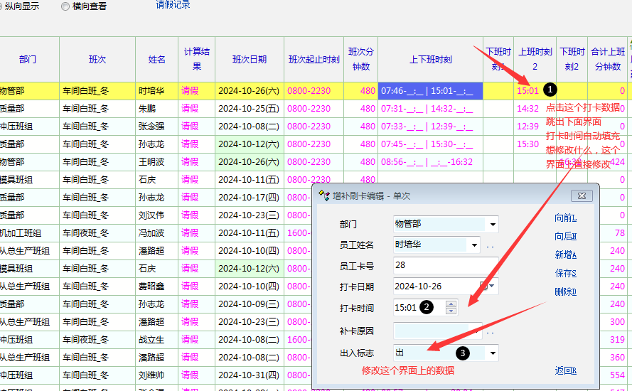 在考勤日帐里面需要处理一些日常数据,但因为数据关联性或者打开数据快捷方式不够,造成非常不便:比如需要打开员工打卡数据,需要修改“进”还是“出”---目前需要先去查找员工打卡数据,再找到这一条数据,再打开修改,而没有快捷方式,能够点击这个打卡数据直接打开这条数据进行修改。