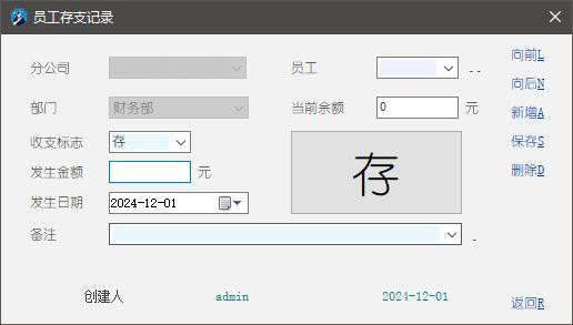 我的意见是把员工存支做也两个窗口,存为一个窗口,支为一个窗口,原因是(存和支)在同一个窗口操做起来非常容易出错。