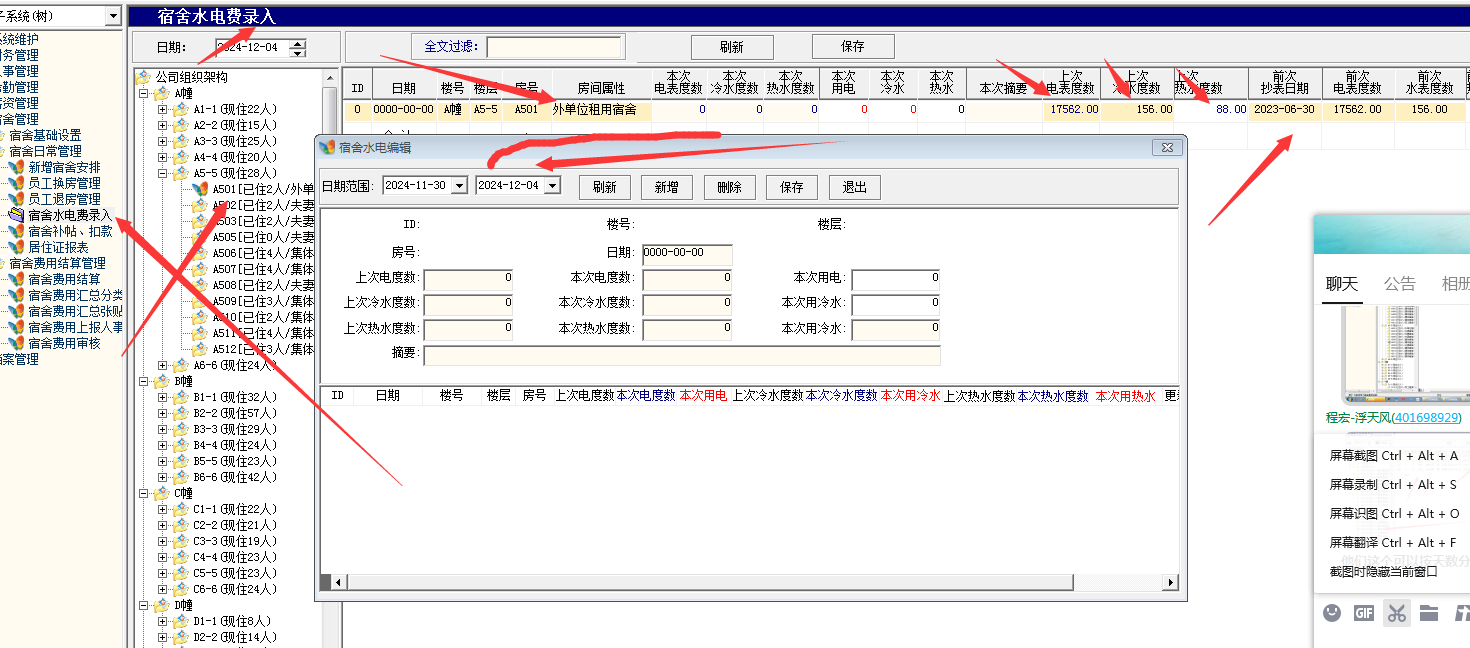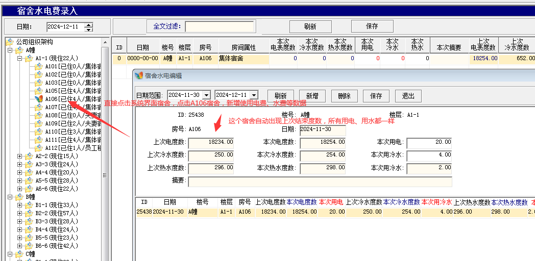 1.水、电等度数的输入方式------点击哪个宿舍,就添加哪个宿舍的水电度数、以及这个宿舍里面的其他费用金额等数据