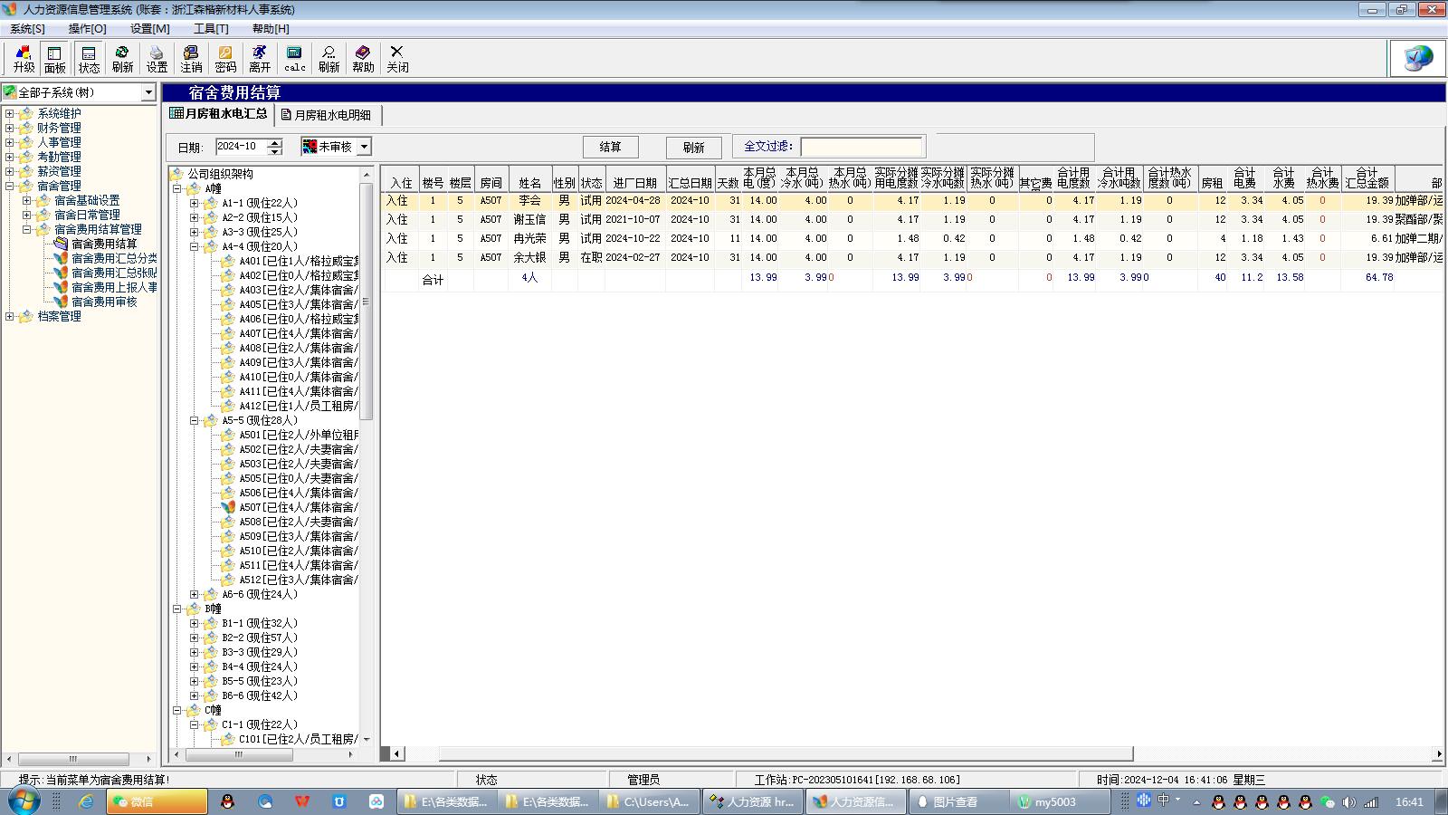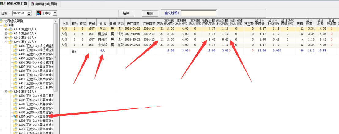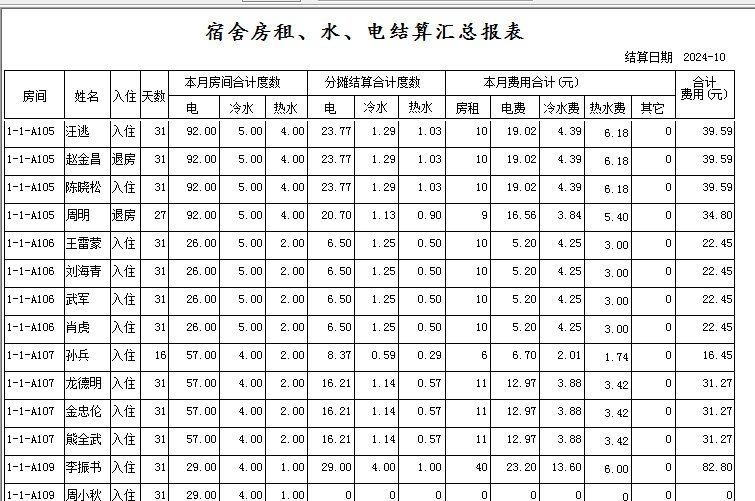 3,选择月份,点击结算,系统自动生成所有宿舍每个人产生的水电费、其他费用等的扣除----完全没有大量的手工输入等动作。