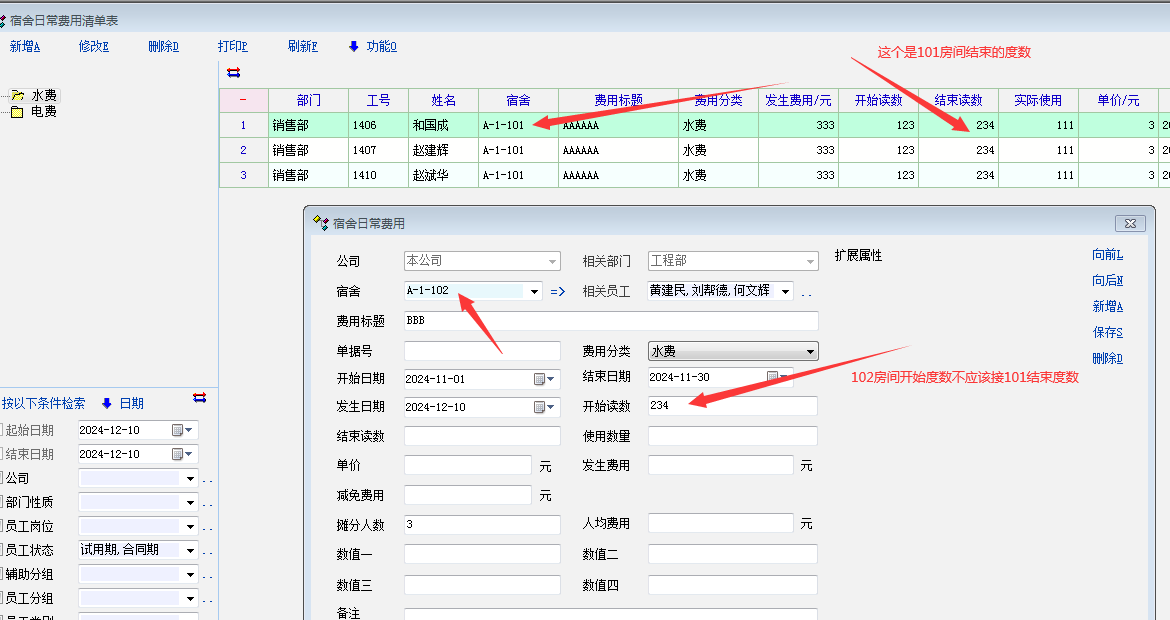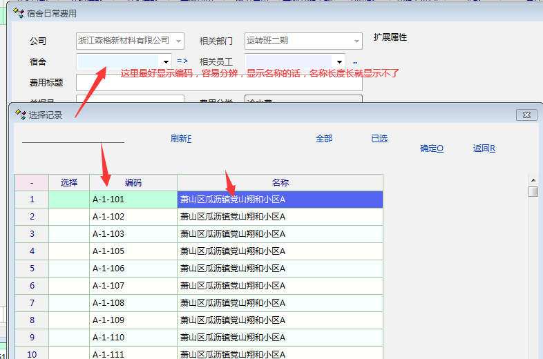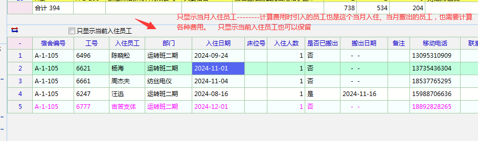 费用管理里面---新增费用-----选择宿舍编号(最好显示编号,不要名称,因为有的名称长,显示有问题,而且编号也容易记)-----里面的员工应显示当月入住的员工(包含入住、入住搬出、当月入住搬出的人)------而不是当前入住的员工