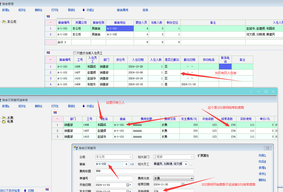 目前,在这个系统中,员工宿舍管理的“水电费”分摊方式,只是对入住人员进行平摊,而没有考虑中途入住和中途退宿的人员,这点是不合理的。