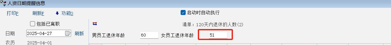 人资日期提醒 - 男员工输入指定退休年龄列表中可以显示,尝试输入几个女员工退休年龄都没有显示,不知是不是没有代入计算规则。