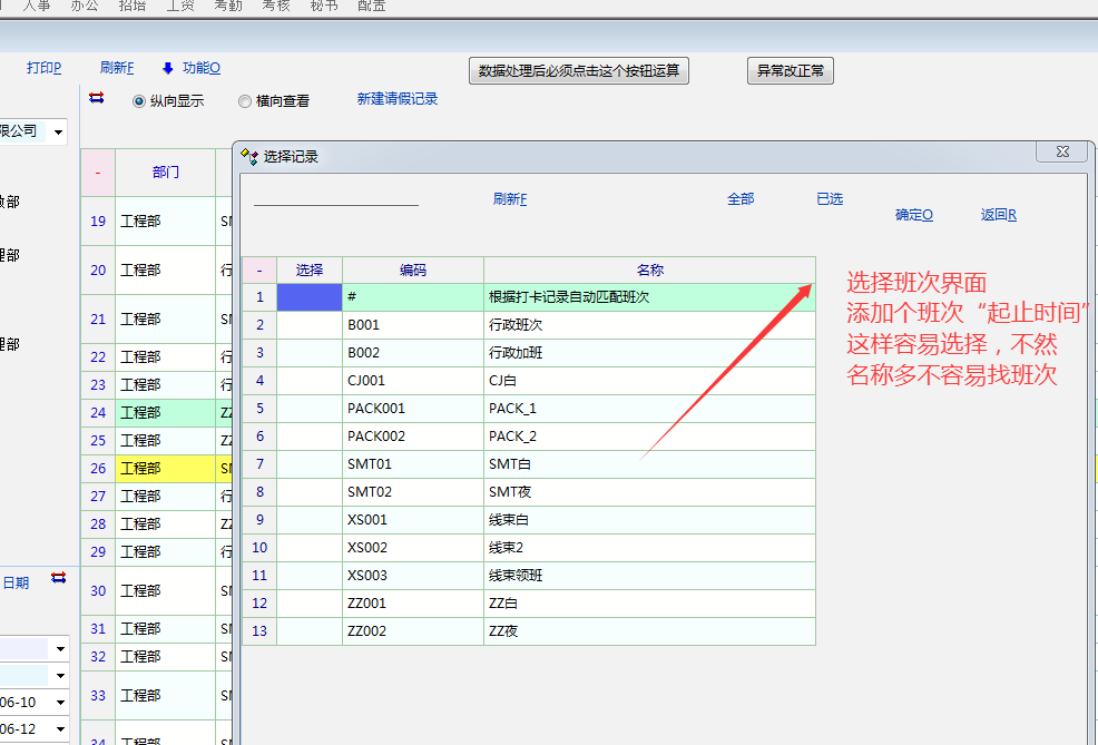 原创_考勤日账----右键选择记录进行重新排班---选择班次界面添加班次起止时间_人力资产
