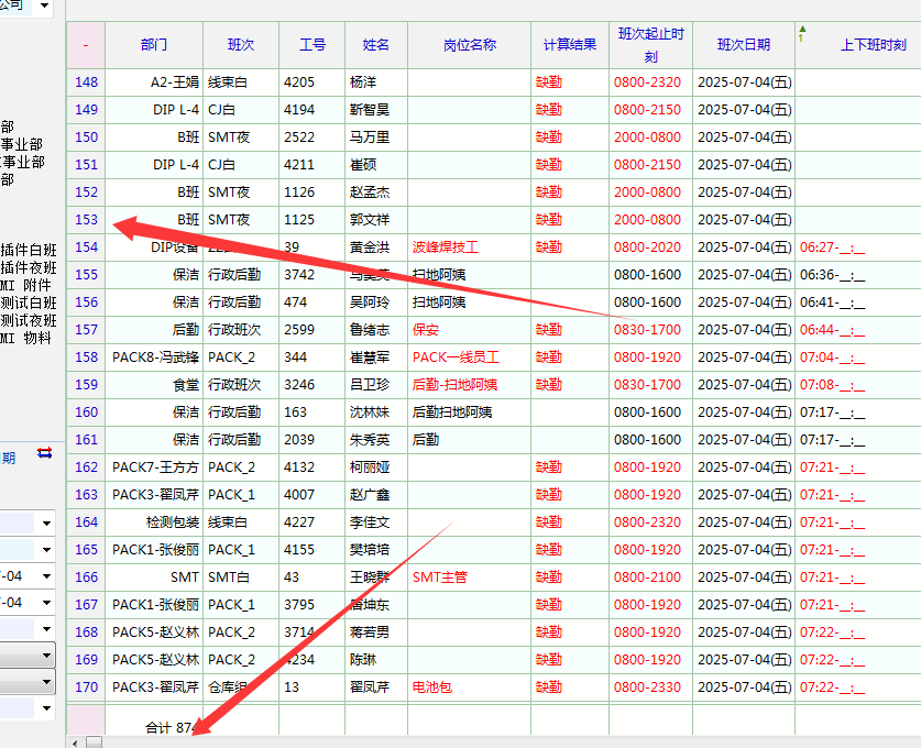 像这个处理后的结果里面,最好加上总人数,打卡人数:人事要上报早上打卡统计结果:比如总人数874人,早上未打卡人数153人。目前看不到总数据,实际打卡人数的统计