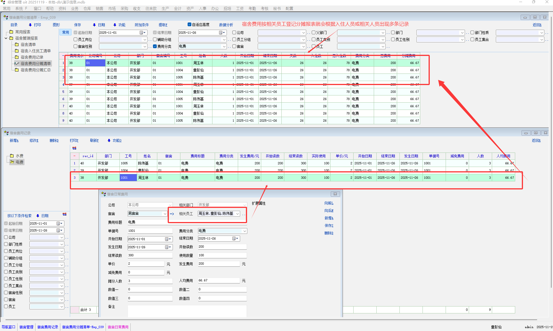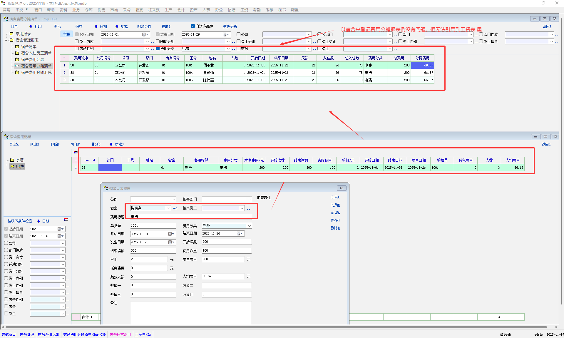 2:以宿舍号登记费用,分摊报表正常,但无法引用到工资表里的宿舍费用中