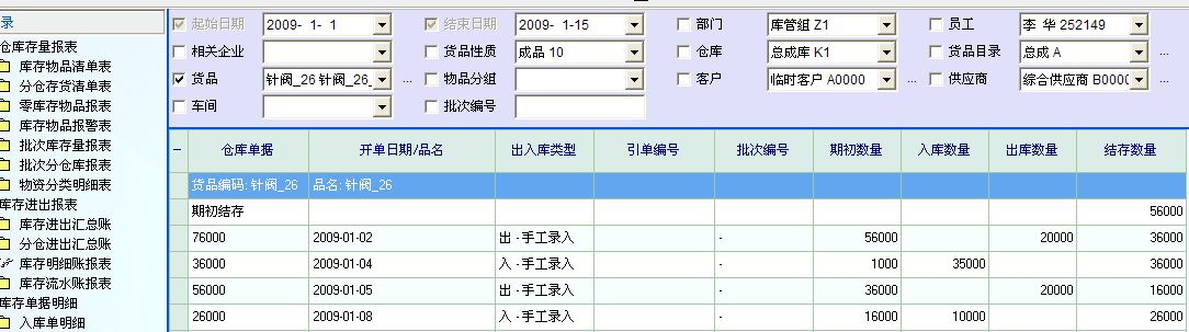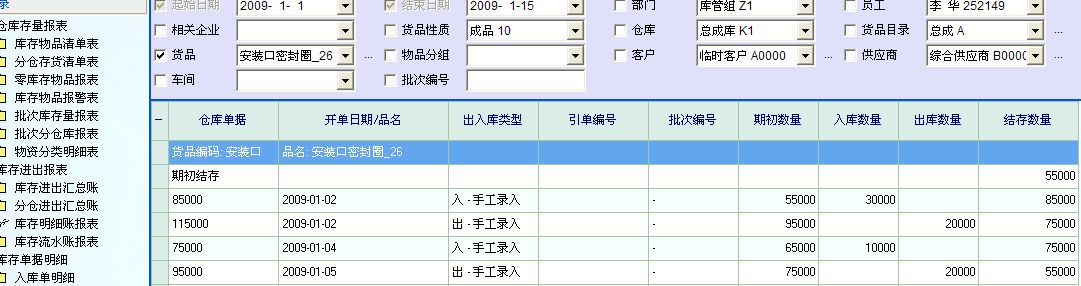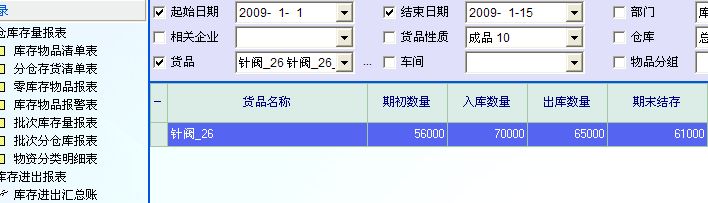 我从2009年1月1日启用新数据库,初始化数字就应是(上)期末结存和(本)期初数量,但有不是的。如截图08,针阀_26初始化数字为21000,但在截图1、截图2里,期初结存和期初数量里却是56000.导致当前库存数据错误。截图7显示期末结存61000.。而截图3是正确的26000。奇怪的是截图08的其他货品的数字都对。初始化数据数千,不知还有没有错。