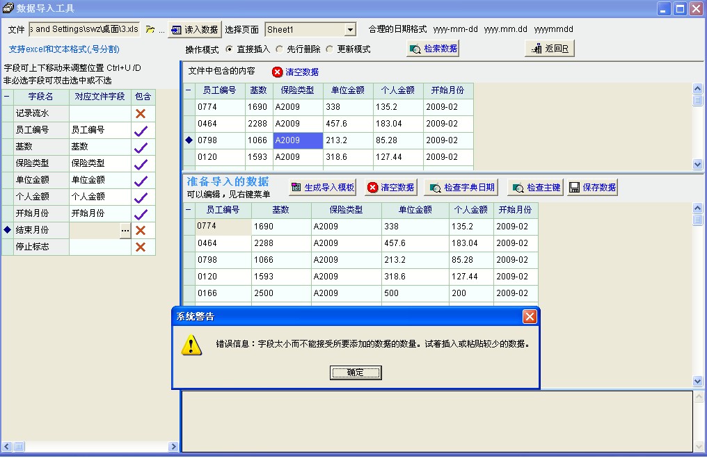 我在导入多个员工的保险数据时,碰到如附图所示的问题。不知道如何处理?想得到帮助?