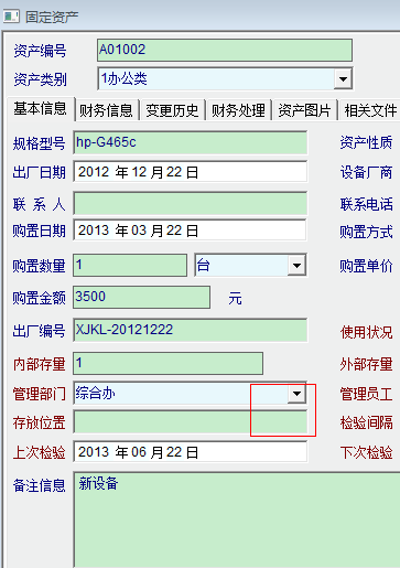 在这个模块里面,涉及到一些仪器设备存放位置的问题,由于数量较多,位置相对较少,一个一个输入存放位置太麻烦了。在此向大侠们请教能不能把存放位置也设置一个下拉菜单,就像管理部门那样可以选择(如图所示),如可以,应该怎么设置?