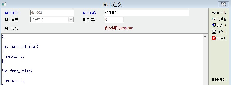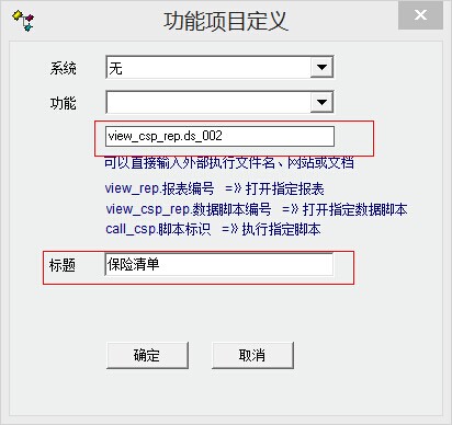 定义一个自定义报表就行了 在配置管理----数据脚本里,扩展查询右键,增加 脚本名称就填保险清单吧 然后把下面的内容替换掉脚本定义里的内容 int func_def_lmt() { def_lmt_set_val("aa","a") return 1; }; int func_def_field() { db_set_field_count(11); db_set_field_info(0,'dept_name',"部门",80); db_set_field_info(1,'emp_id',"工号",50); db_set_field_info(2,'name',"姓名",50); db_set_field_info(3,'paper_id',"身份证号",150); db_set_field_info(4,'home_address',"家庭住址",150); db_set_field_info(5,'insurance_name',"保险类型",50); db_set_field_info(6,'beg_month',"开始日期",50); db_set_field_info(7,'stop_flag',"是否停止",50); db_set_field_info(8,'end_month',"终止日期",50); db_set_field_info(9,'v_no',"保险编号",50); db_set_field_info(10,'note_info',"备注",50); return 1; }; int func_def_imp() { return 1; }; int func_init() { return 1; }; int func_query() { string sql; sql="select b.dept_name,a.emp_id,c.name,c.paper_id,c.home_address,d.insurance_name,a.beg_month,case a.stop_flag when 'N' THEN " sql=sql+"'否' else '是' end,a.end_month,a.v_no,a.note_info from emp_insurance a,emp_dept b,emp c,emp_insurance_type d " sql=sql+"where a.emp_id=c.emp_id and b.dept_id=c.dept_id and a.insurance_type_id=d.insurance_type_id" db_run(sql) return 1; }; |