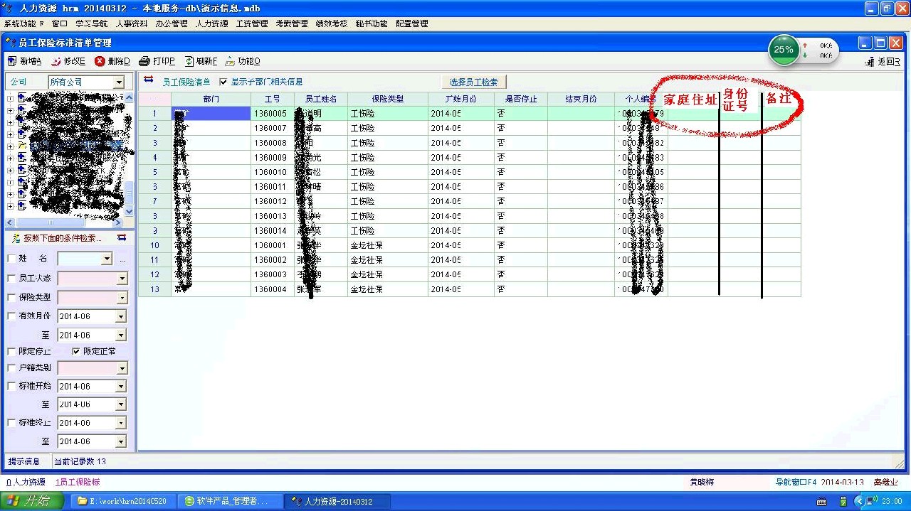 个人觉得还是在“员工保险标准清单管理”页面中增加显示“身份证号、家庭住址”这些字段显示比较方便实用! |