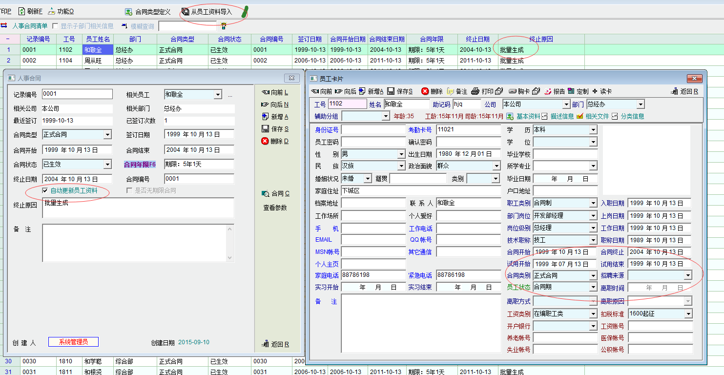 回复楼上的话,人事合同的信息是与员工资料相关联的,这个我知道。我说的是学习经历、职称管理也与人事合同一样要与员工资料相关联;这边在学习经历里录入了,那么员工资料里面最高学历自然会显示,而不是在分类信息中显示