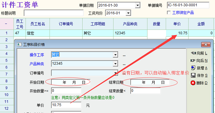 添加了开始日期与结束日期,退出系统,再次登陆后,系统就不会自动输入绑定单价了。估计计件单价与开始日期、结束日期相匹配时,系统对于单价是否在日期的有效期内的判断有误。