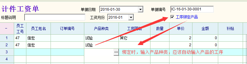 在计件工资功能中,当工序绑定产品时,输入产品后,系统会自动输入绑定工序。而在计件工资单中,工序绑定产品时,输入产品各类后系统却不会自动输入绑定的工序,需要手动输入或选择相应的工序,建议完善这个功能:当计件工资单中工序绑定产品时,输入产品后系统能自动输入绑定的工序!否则,这个“工序绑定产品”的功能也就没有什么作用了。